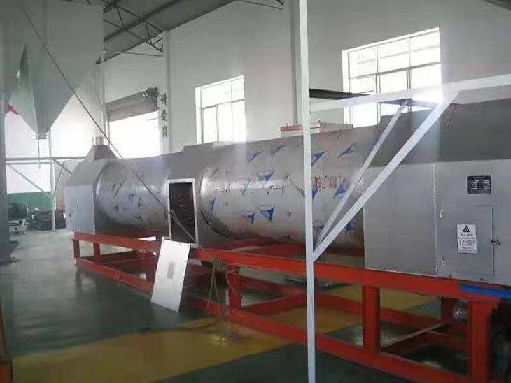 我們解決其技術問題所采用的技術方案是:一種新型環保節能熱風炒爐,由電源供電,包括第一燃燒室、第二燃燒室、熱風炒爐滾筒、存料機、自動喂料器、出料機、引風機和排潮風機,所述熱風炒爐滾筒的入口端通過自動喂料器與所述存料斗連通,所述熱風炒爐滾筒的入口端還通過風道與所述排潮風機連通,所述熱風炒爐滾筒的出口端與出料機連通,所述第一燃燒室和第二燃燒室通過風道與引風機連通,所述第一燃燒室和第二燃燒室分別位于所述熱風炒爐滾筒的下方,所述熱風炒爐滾筒軸心線與水平面形成2°到8°的夾角,所述第一燃燒器和第二燃燒器安裝位置在相應燃燒室的前端或者相應燃燒室的兩個側面。我們設備取消了原熱風炒爐所配套的單獨熱風爐、彎段風道或直段風道;在炒爐滾筒下方設計安裝兩份熱風燃燒室,用燃燒器產生的熱風直接對滾筒進行加熱,最大限度地縮減了炒爐散熱環節和面積,從而實現炒爐連段式加熱。與現有設備相比,我們公司設備充分利用了熱風釋放的熱量,減少了熱量損失,單噸油料或糧食加工消耗添人氣甚至能降低到25nm3,降低了17%,節能降耗效果非常明顯,得到了客戶的一致好評。與現有設備相比,同等日加工量,所配兩臺燃燒器合計功率比現有設備燃燒器功率下降20%-30%,熱風設定溫度有750-800℃下降到400-500℃,明顯延長了炒爐的使用壽命。第一燃燒室和第二燃燒室的功能各不相同,工作溫度也不一致,第一燃燒室和第二燃燒室能夠實現分段加熱溫度控制,更加靈活與合理,安全可靠,便于操作與控制。